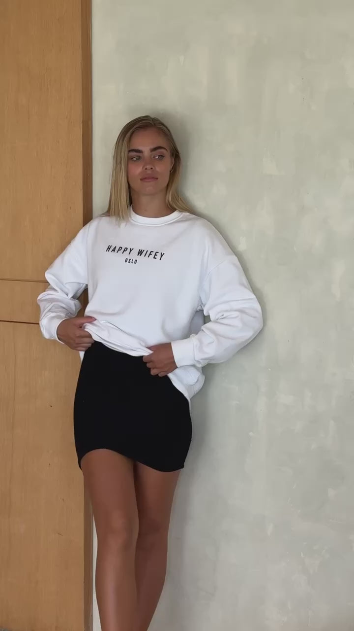Finally it's here! Our signature Happy Wifey Oslo sweatshirt now comes with an improved fit. The drop shoulder seam makes the sweatshirt comfy and oversized, yet super stylish. The material is so soft you'll never want to take it off.